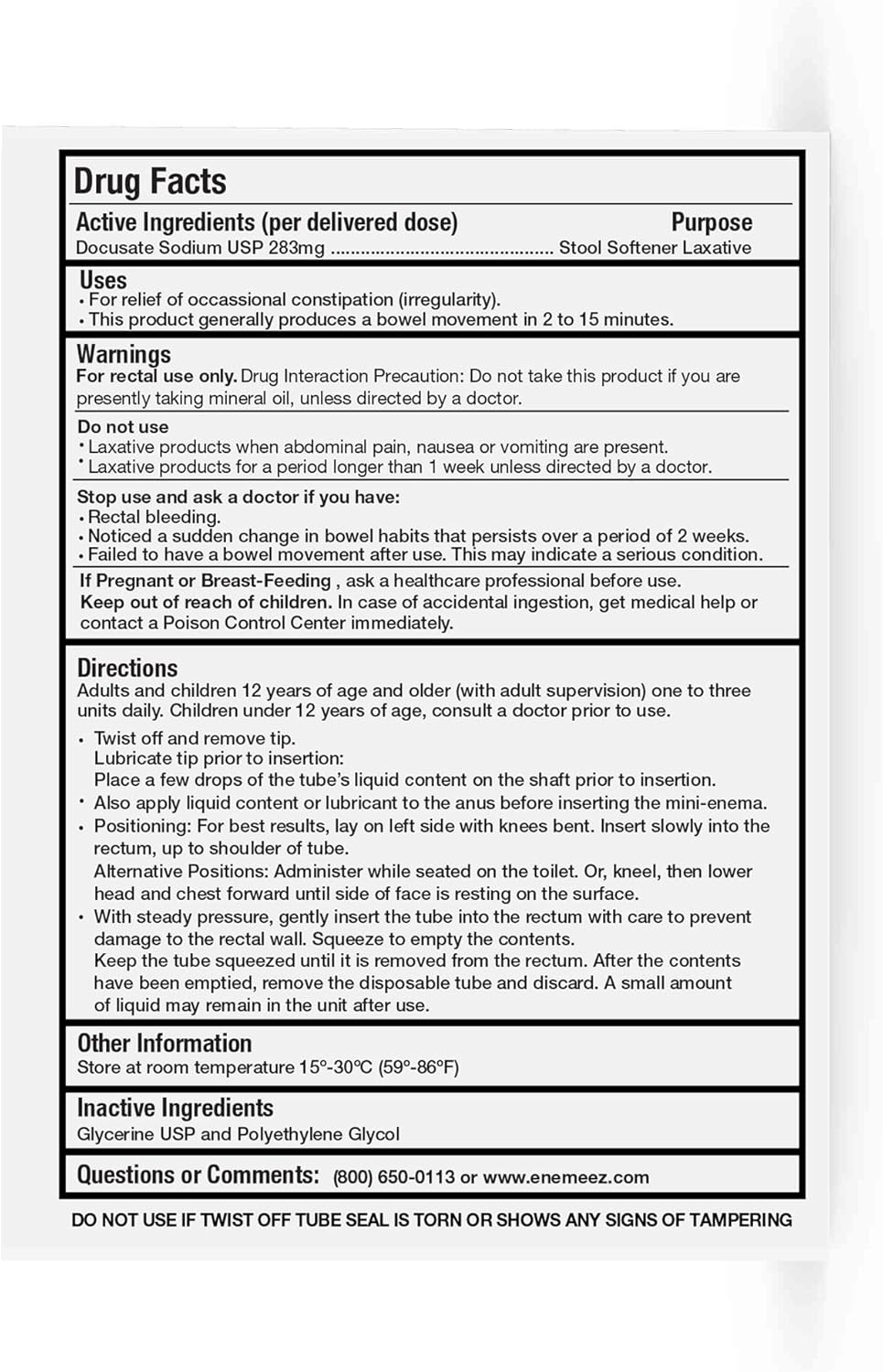 The ENEMEEZ formulation functions as a stool-softening, hyperosmotic laxative by drawing water into the bowel from surrounding body tissues. The docusate sodium acts as a softener by preparing the stool to readily mix with watery fluids. The increased mass of stool promotes a bowel evacuation by stimulating nerve endings in the bowel lining and initiating peristalsis. Not only does it soften and loosen the stool, but it initiates a normal, replicated stimulus.