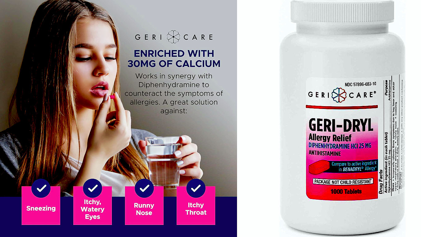 Geri-Dryl Allergy Relief Tablets – 25 mg of diphenhydramine hydrochloride. Compare to active ingredient in Benadryl Ultratabs. 100 tablets per bottle. Benadryl a registered trademark of McNeil Consumer Healthcare, division of Johnson & Johnson Consumer Inc
