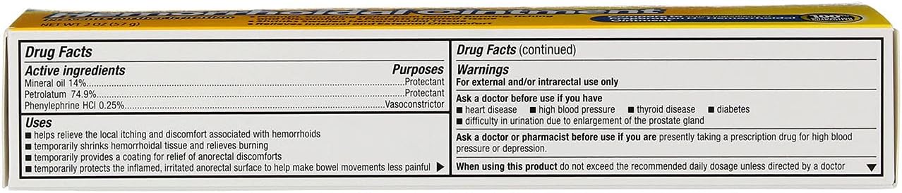 Hemorrhoidal Ointment gives fast temporary relief from the painful burning, itching and discomfort of hemorrhoids. Hemorrhoidal Ointment’s active ingredients are mineral oil, 14%, protectant; petrolatum 74.9%, protectant; and phenylephrine HCl 0.25%, vasoconstrictor.